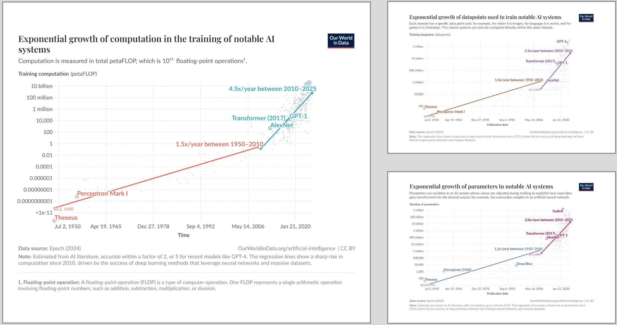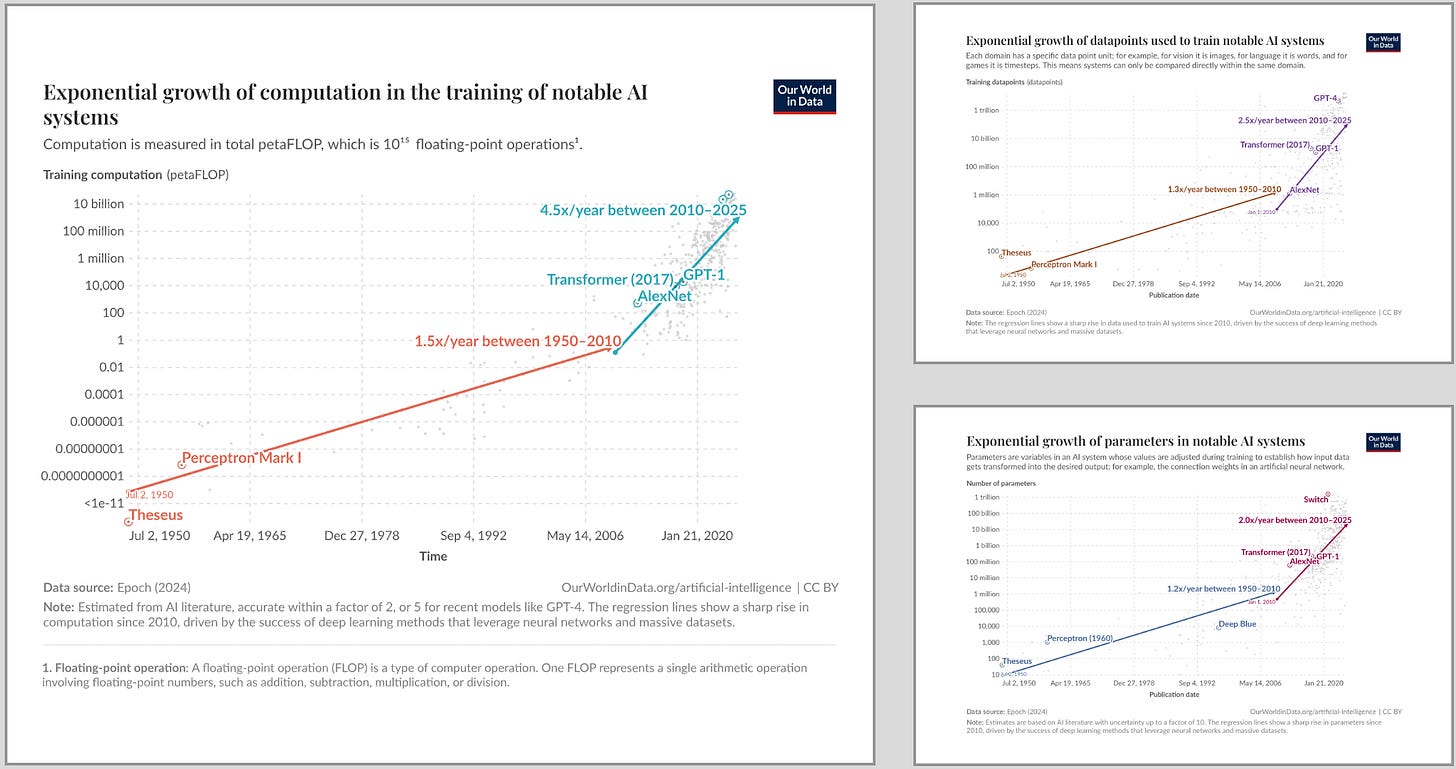 AI’s scaling has been dependent on how much data, parameters, and computational power can be fed to the models. The charts below from “Our World in Data” demonstrate how stupendous the rise has been.